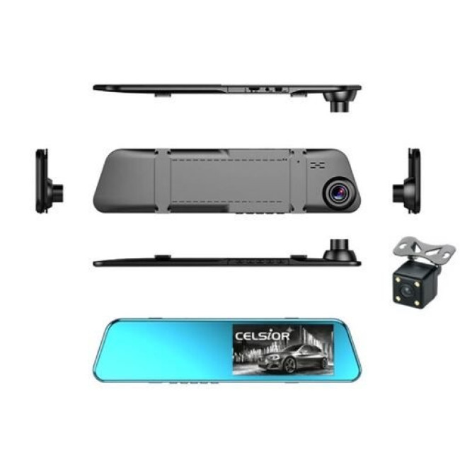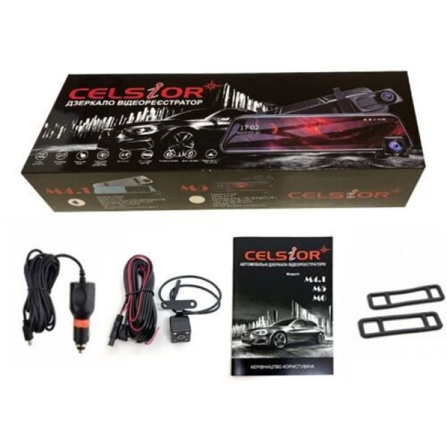 | Комплектація | Дзеркало Celsior DVR M4.1 Додаткова камера Кабель для підключення додаткової камери (5.5 метрів) Кріплення для дзеркала Зарядний пристрій від прикурювача 12В Інструкція |