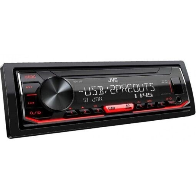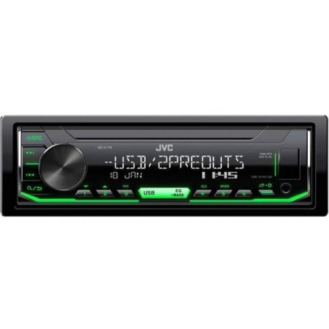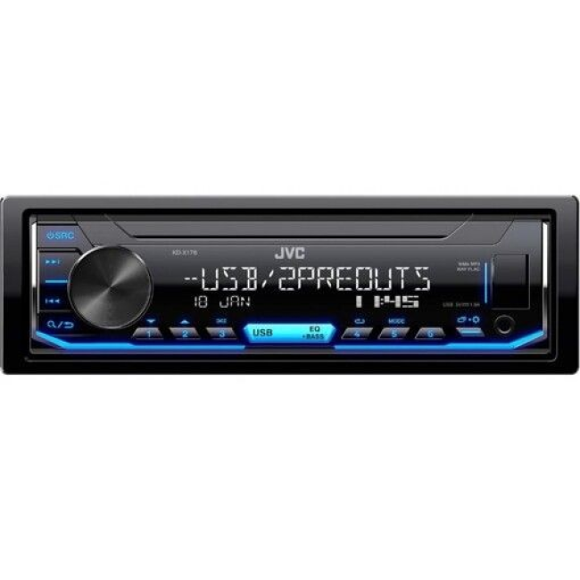 Цифровий медіаресивер JVC KD-X176 без диску, але з USB/AUX. Підтримує формат FLAC та підтримка УКХ. Автомагнітола має багатозмінне підсвічування панелі, Параметричний 3-смуговий еквалайзер (15 передустановок) і може підтримувати дистанційне керування на кермі.