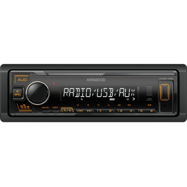 Автомагнітола Kenwood KMM 105AY — надійний бездисковий USB-ресивер, фірмовий дизайн та відмінна якість відтворення звуку. Універсальна магнітола 1DIN (182 x 53 x 114 мм) підійде для салону будь-якого автомобіля. Передня чорна панель знімна з бурштиновим підсвічуванням кнопок. Дисплей монохромний з білими символами. Ергономічною є розміщення на передній панелі кнопок управління, також доступні роз'єми USB та AUX.