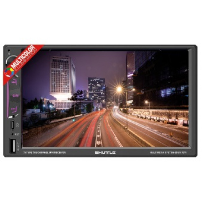 SHUTTLE SDUD-7070 IPS - це 2DIN MP5-ресивер з 7-дюймовим IPS-екраном (800x480), що підтримує Apple CarPlay та Android Auto через USB. Пристрій оснащений FM-тюнером, Bluetooth для гучного зв'язку, підтримує відеовходи для камер заднього виду та має потужність 4х50 Вт.