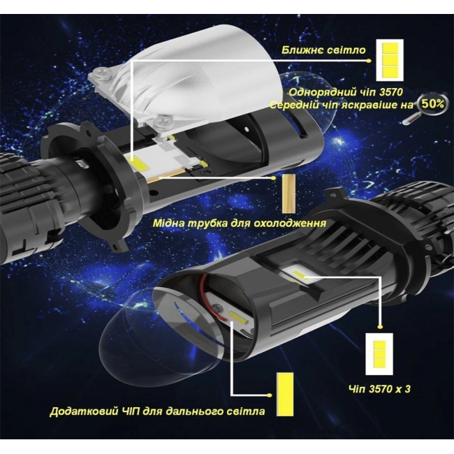 Лампа розроблена спеціально для рефлекторної оптики, має цоколь H4 з функцією ближнього та далекого світла. Вбудований активний кулер та радіатор з авіаційного алюмінію гарантують ефективне охолодження та тривалий термін служби.